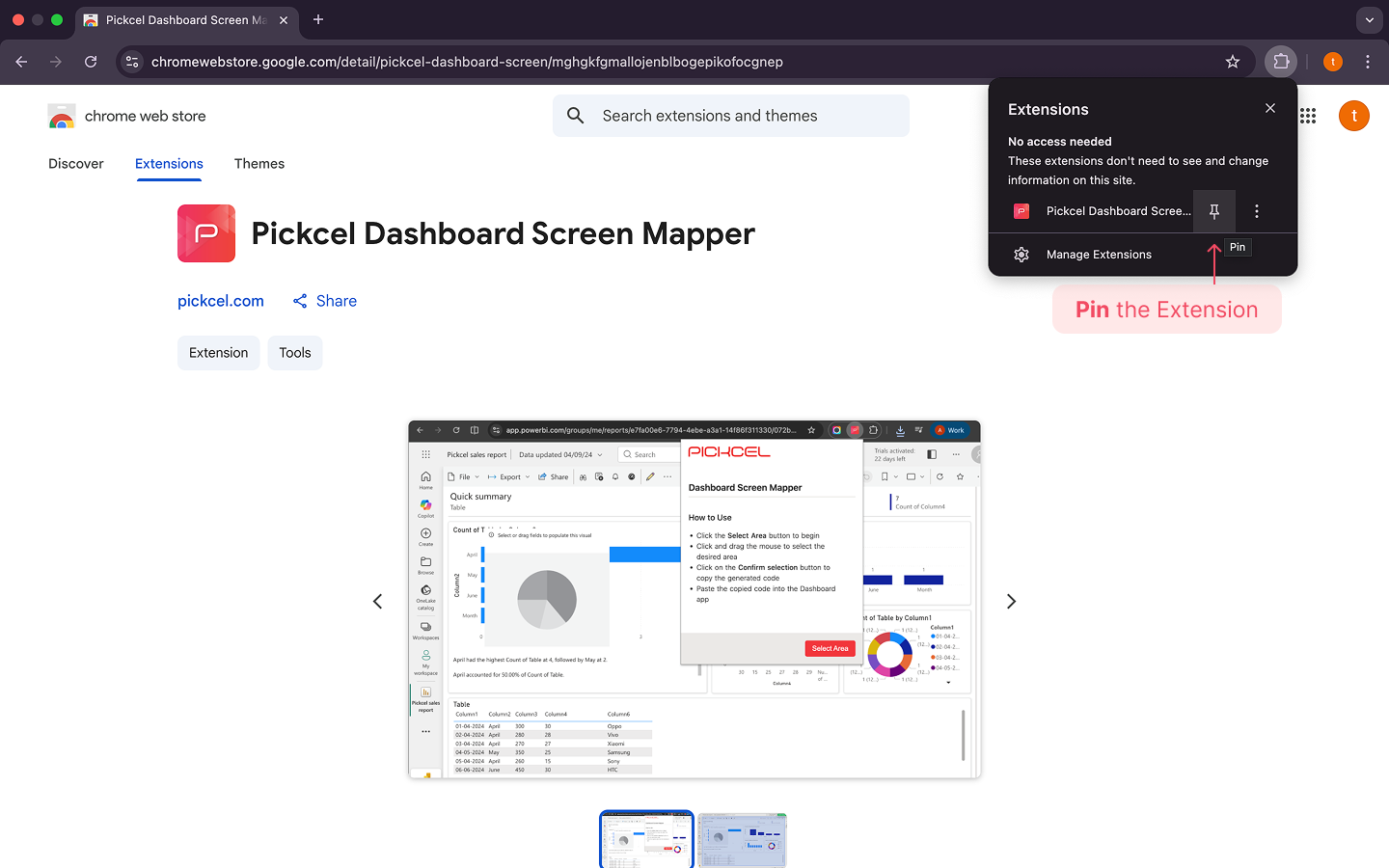 Click the puzzle icon in your Chrome toolbar and pin the Pickcel Dashboard Screen Mapper Extension for quicker access.