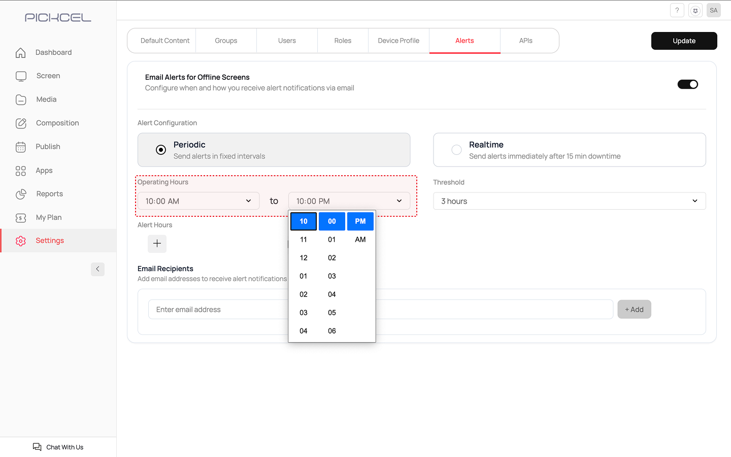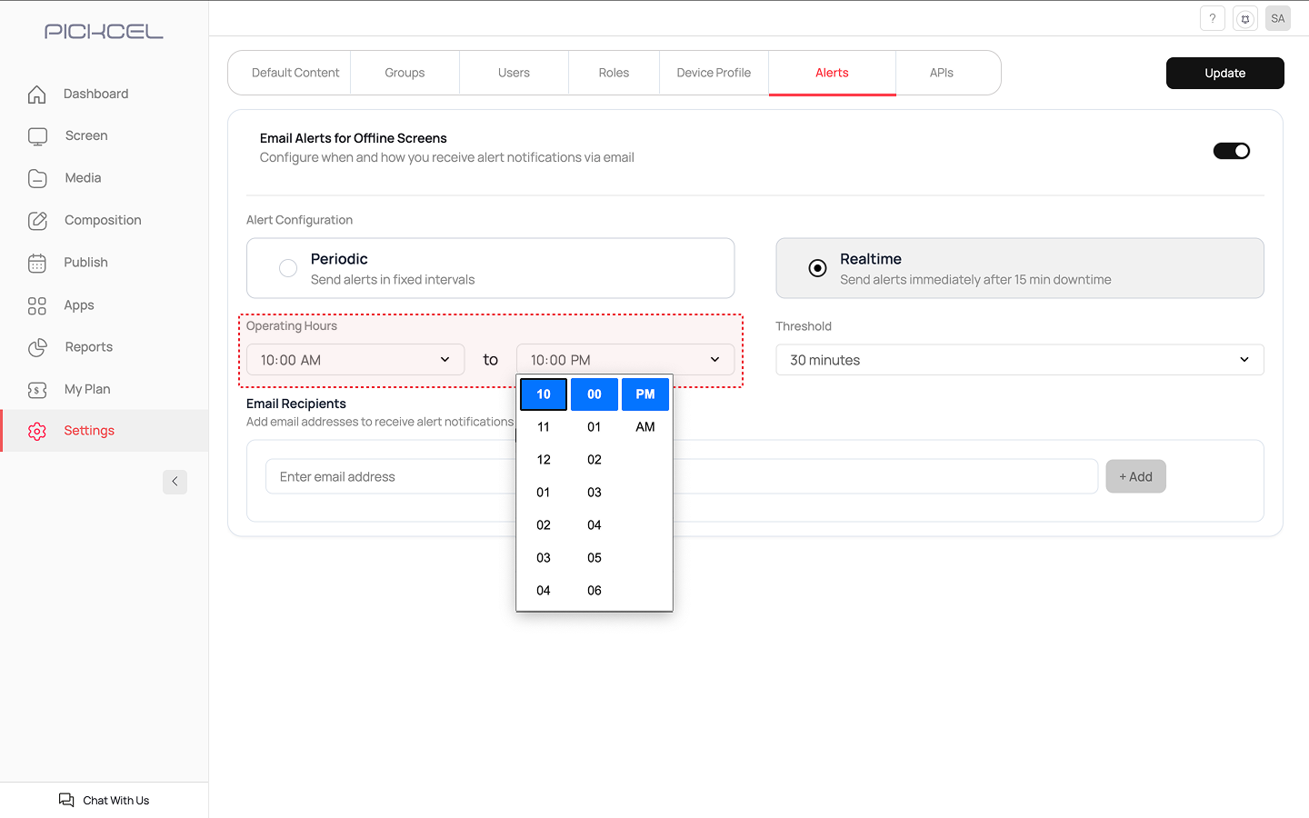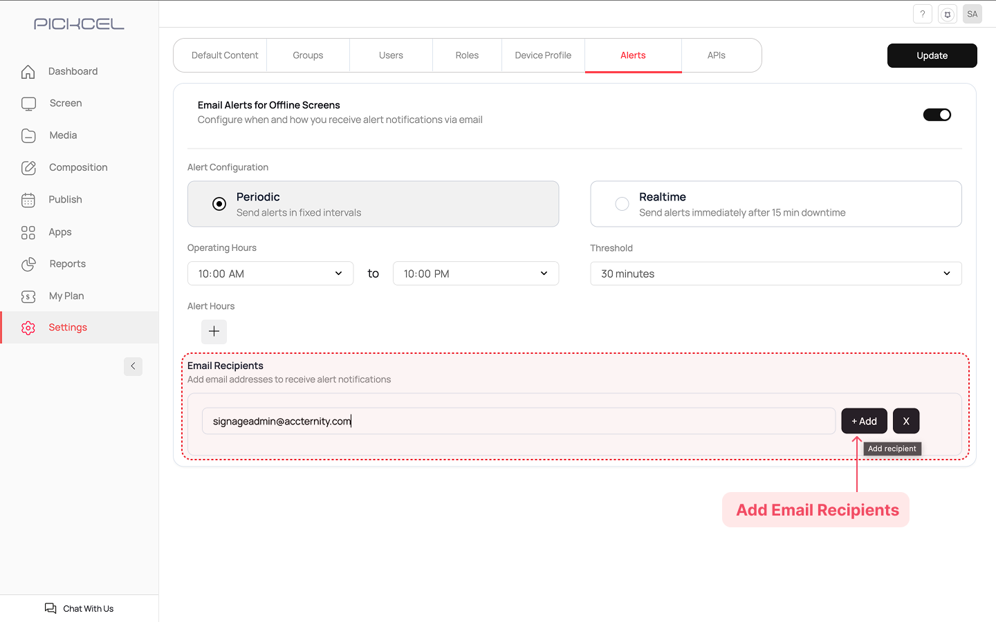 Log in to your Pickcel Console. From the main navigation bar on the left, click on Settings. In the Settings menu, select the Alerts tab.
