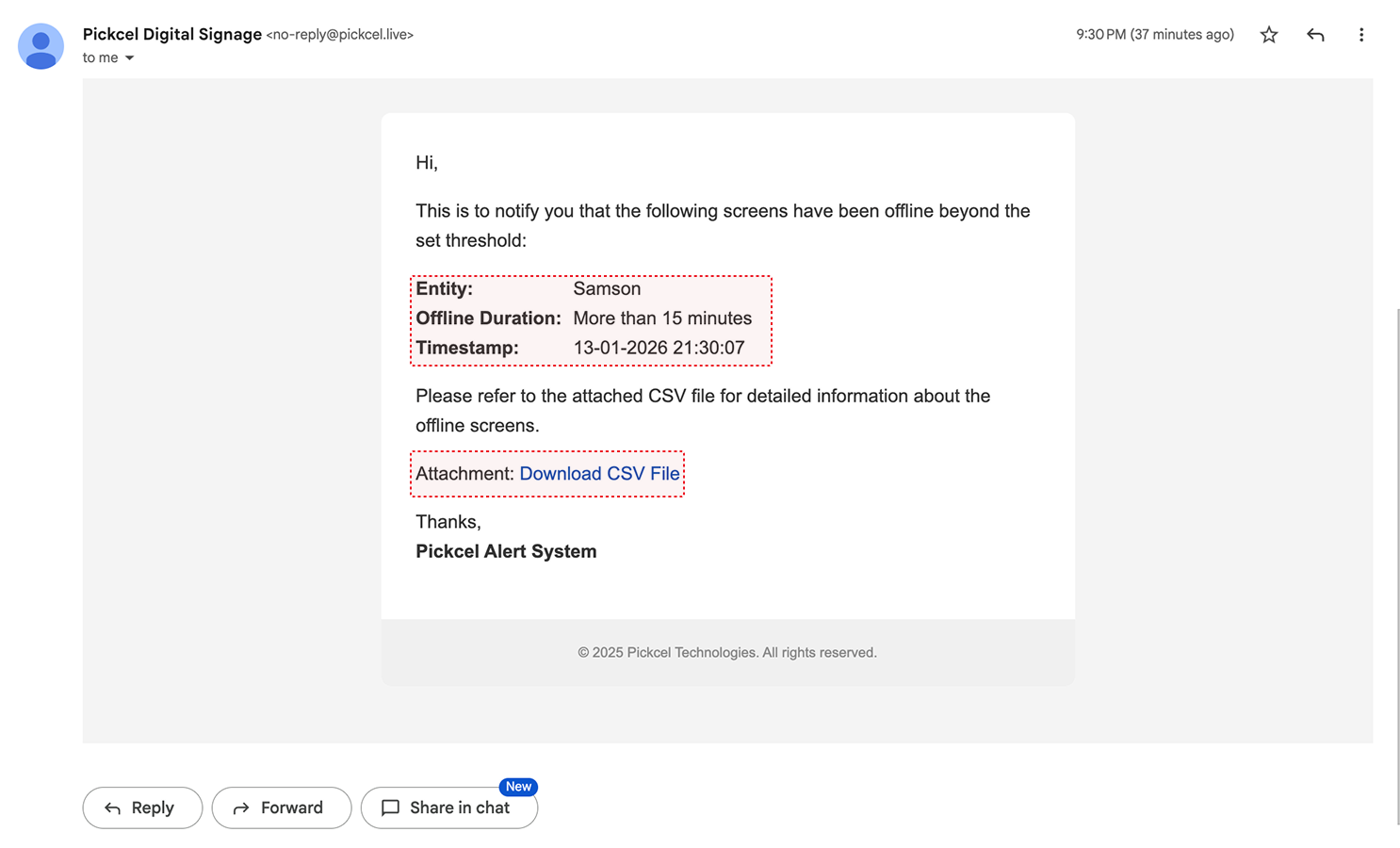 [Pickcel Alert] Screen Down NotificationEmail Body: Contains:- Offline duration threshold that triggered the alert