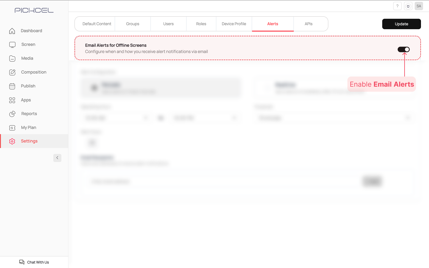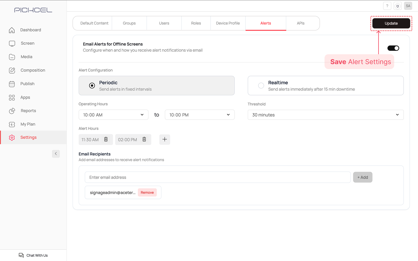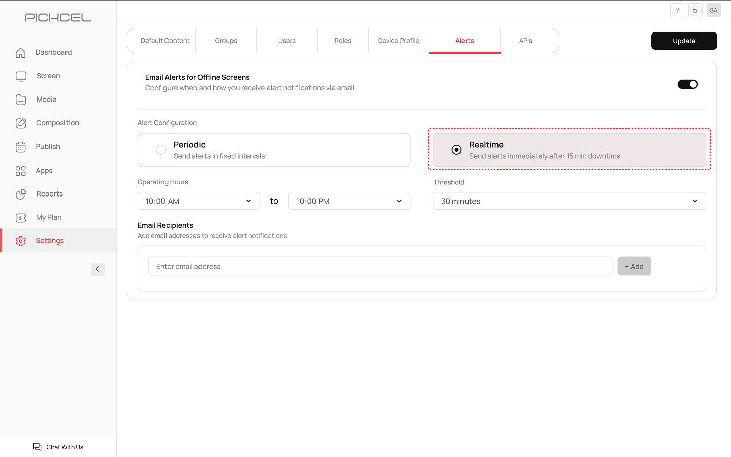 Once you have configured all the settings based on your chosen alert type, click the Update button at the top right corner of the page to save your settings.
