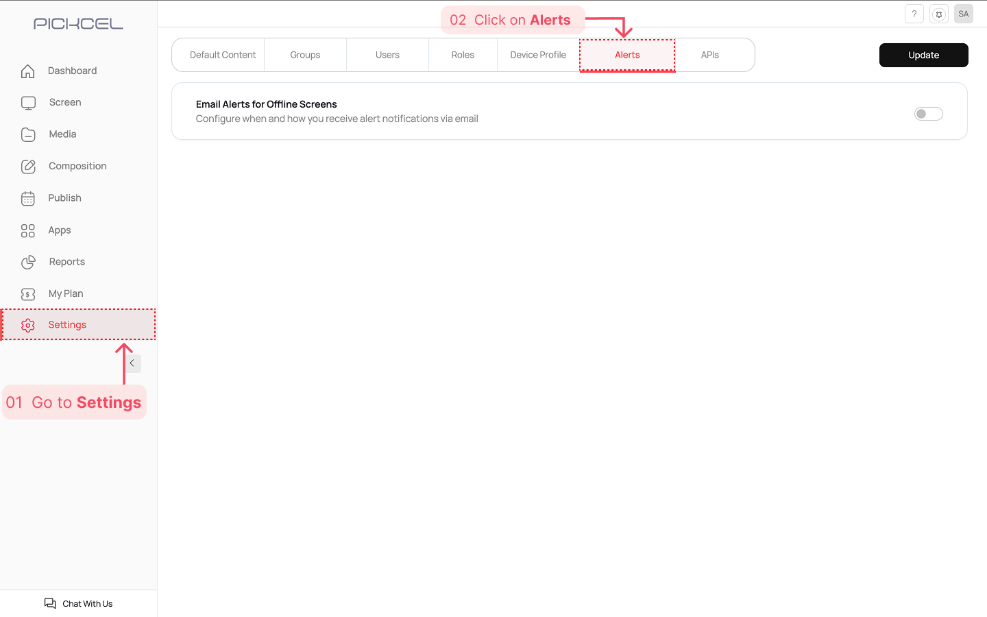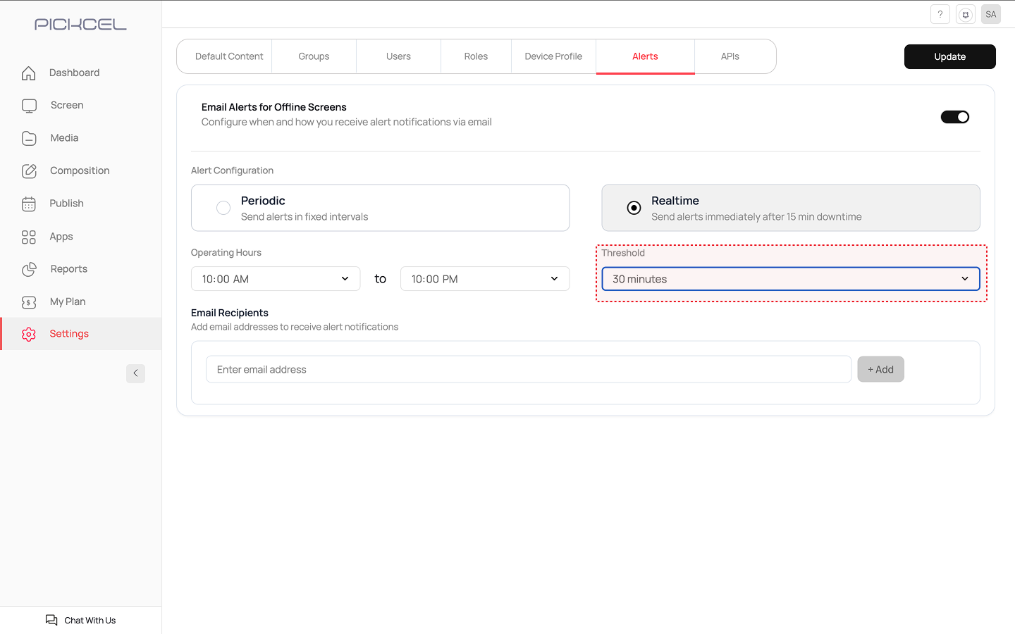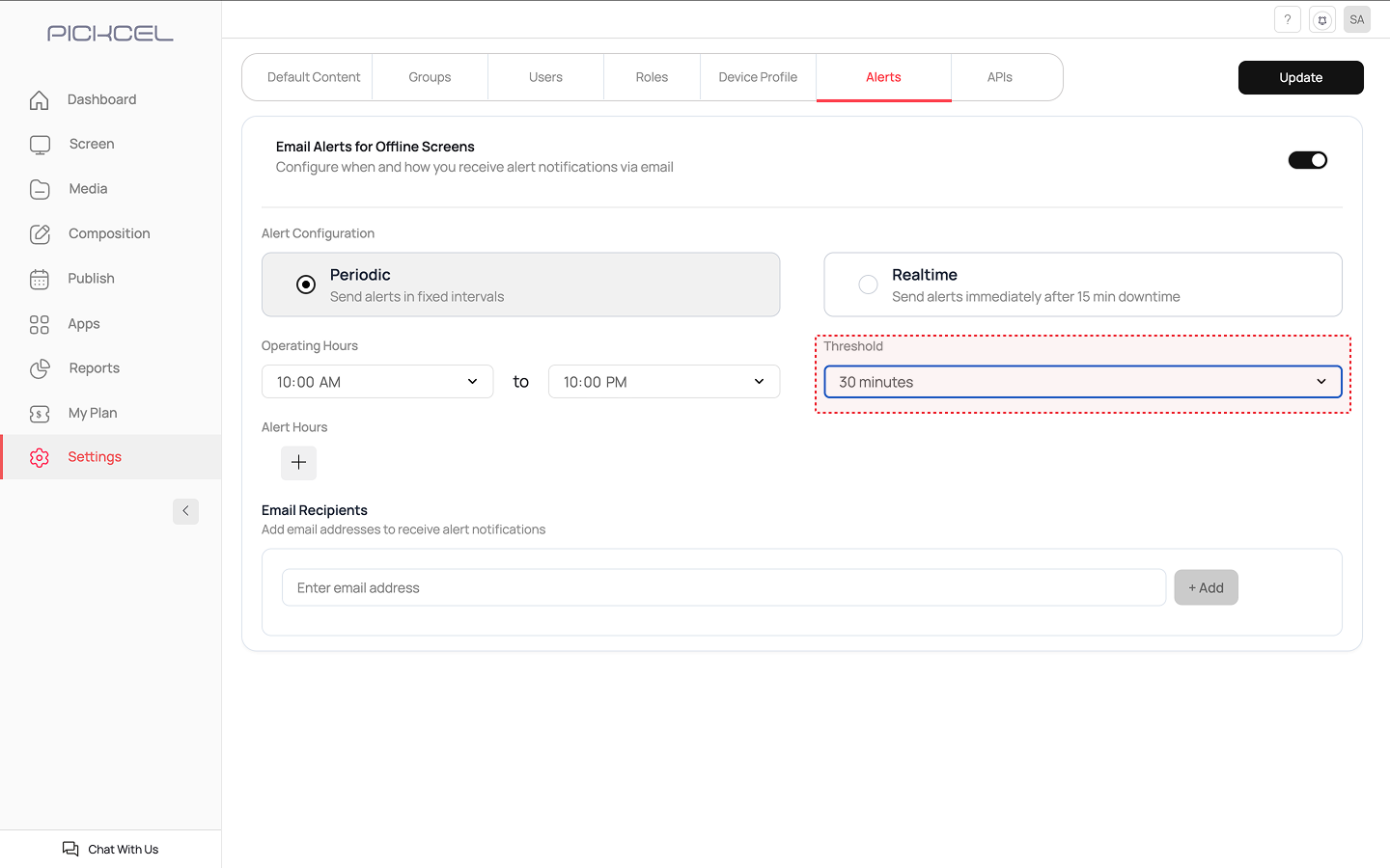 Once you have configured all the settings based on your chosen alert type, click the Update button at the top right corner of the page to save your settings.