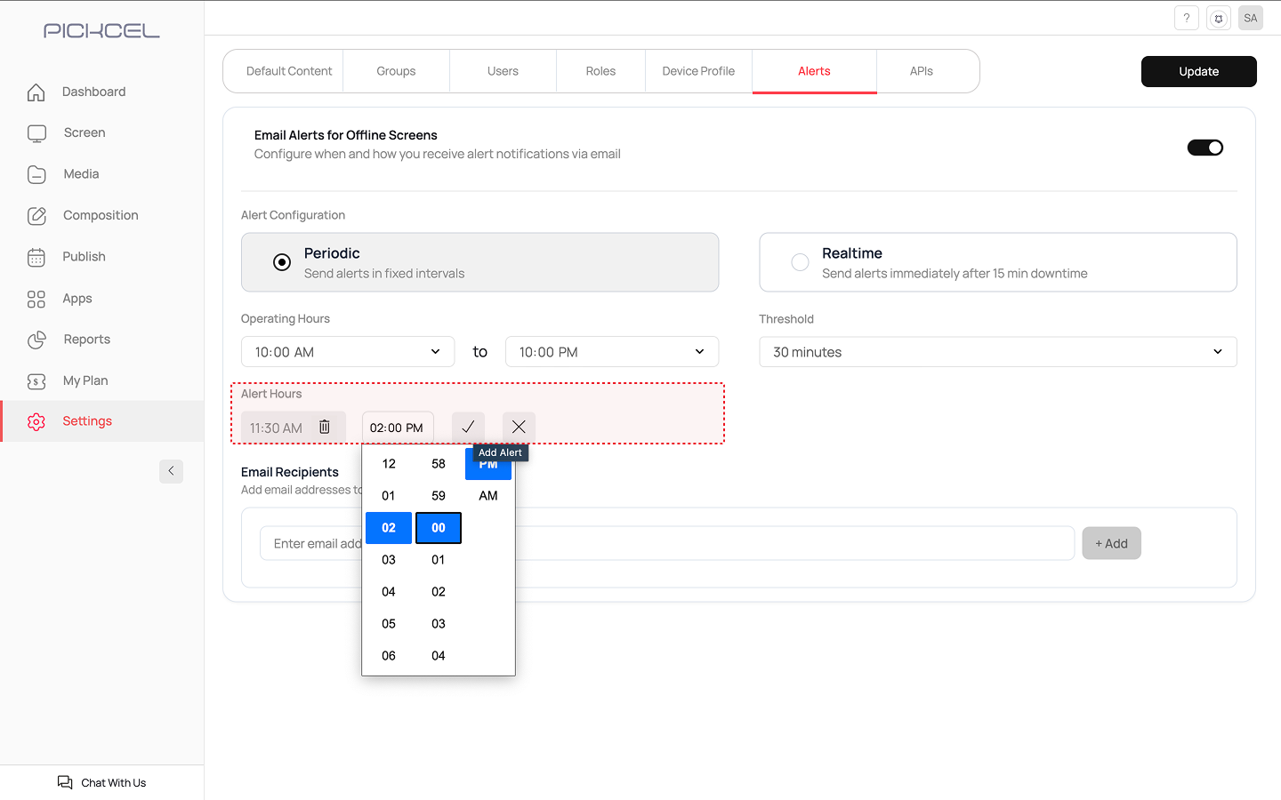 11:30 AM and 02:00 PM with a threshold of 30 minutes. Your screen goes offline at 10:45 AM. At 11:30 AM, the system checks and finds the screen has been offline for 45 minutes (exceeds threshold), so an email is sent. You’ll receive another report at 02:00 PM if the screen is still offline.Best for: receiving alerts at scheduled times throughout the day instead of immediate notifications.Configuration Steps for Periodic Alerts