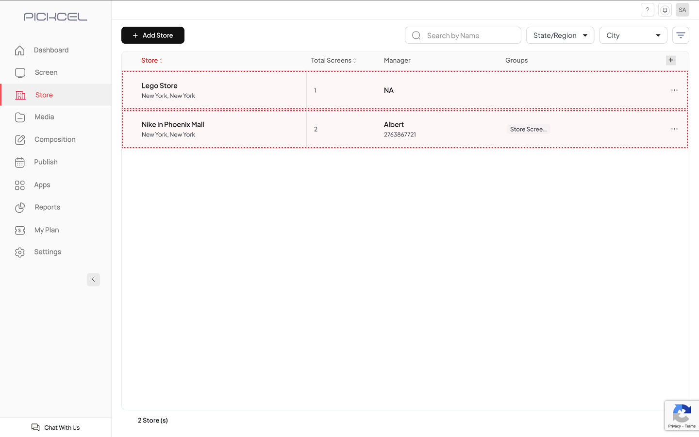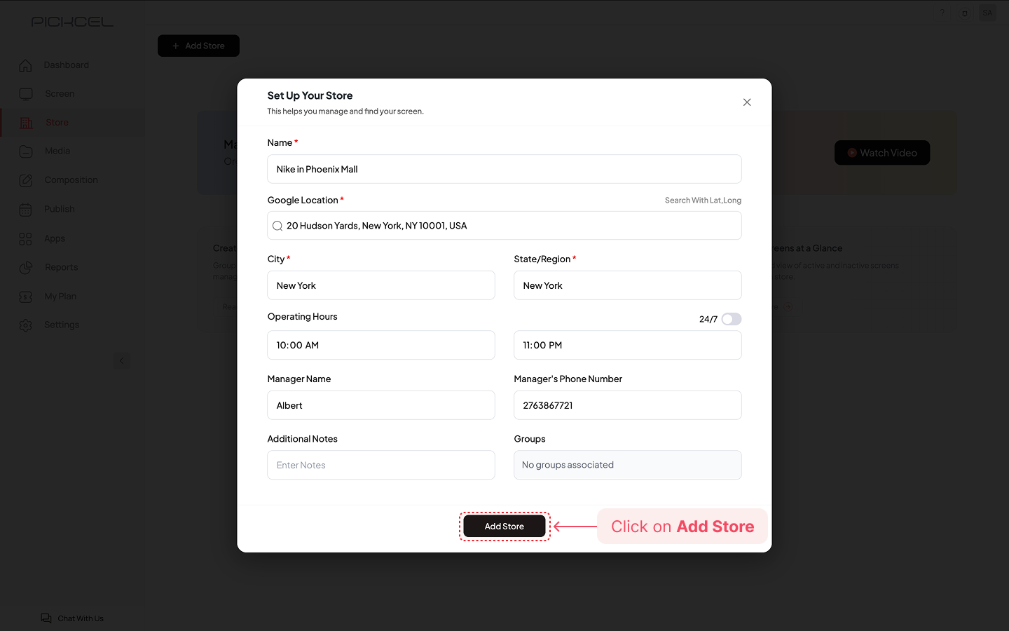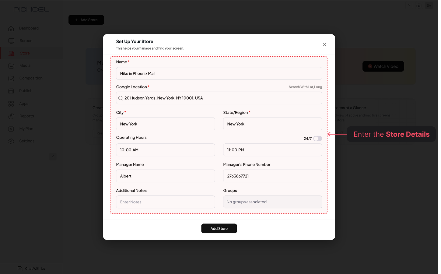 Log in to the Pickcel Console. From the left navigation menu, click on Store, then click the + Add Store button at the top of the page.